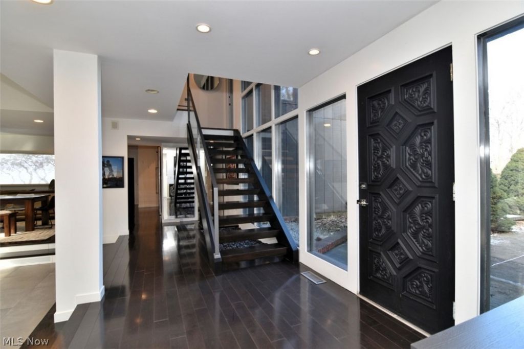 Absolutely stunning, updated and architecturally significant mid-century home on one of Shaker's premier sought after streets. This sophisticated modern home offers an open floor plan and unique, contemporary, desirable design/lifestyle. Spectacular light and bright two-story living room features maple hardwood floors, fireplace and wall of windows opens to deck, patio and magnificent landscaped .93 acre rear yard. Updated chef's kitchen with quartz counter tops, premium stainless-steel appliances, white cabinets, gas cook top, ice-maker and spacious pantry connects to terrific 20x17 eat-in area overlooking the deck and rear yard. Dining room off eat-in kitchen area is adjacent to living room. First floor primary bedroom suite with vaulted ceiling, ample closet space and custom built-ins. Primary spa style full bathroom includes heated floors, steam shower, soaking tub and custom vanity with large sink featuring two faucets. Primary bedroom overlooks and opens to deck, patio and rear yard. First floor includes powder room, laundry and mud room area with built-ins and cubbies. Second floor features three additional bedrooms, updated hall full bathroom and grand loft area overlooking the living room. Lower-level recreation room and attached garage. This stunning home provides a serene retreat in a nearly one-acre park-like setting. The home is the pinnacle of modern luxury, with high end finishes, great for entertaining or family living. Many updates include new hot water tank (2024), new roof (2022), mini split system installed on second floor for additional HVAC zone control (2019), furnace and central A/C (2016), state-of-the-art kitchen appliances and quartz countertops (2014), renovated all bathrooms (2014) and more. Ideal location, close to schools, parks, trails, major amenities, Cleveland Clinic and University Hospital main campuses and University Circle, Cleveland's cultural hub.
